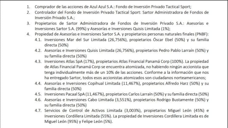 En la misiva se da a conocer el desglose de quiénes son los nuevos dueños de Azul Azul y en donde se reitera y desmienterotundamente que existen propietarios ocultos en el Fondo de Inversión Privado Tactical Sport, la cual adquirió63,07 por ciento de las acciones de Azul Azul.