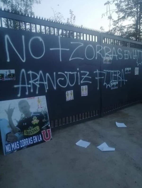 Pero no fue lo único que se pudo ver en las fotografías. Esto porque, el portón del CDA fue nuevamente pintado por los barristas, los cuales pidieron la salida del ex jugador de Unión Española y Dallas FC de la MLS y escribieron la frase:”No más zorras en la U, Aránguiz fuera”.