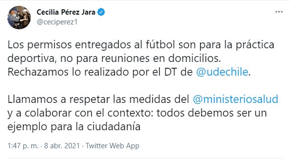 “Los permisos entregados al fútbol son para la práctica deportiva, no para las reuniones en domicilios. Rechazamos en su totalidad lo realizado por el entrenador de la Universidad de Chile, Rafael Dudamel”.