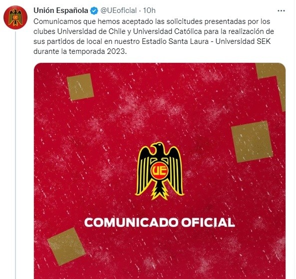 “Comunicamos que hemos aceptado las solicitudes presentadas por los clubes Universidad de Chile y Universidad Católica para la realización de sus partidos de local en nuestro Estadio Santa Laura – Universidad SEK durante la temporada 2023”, destacaron desde Unión Española.