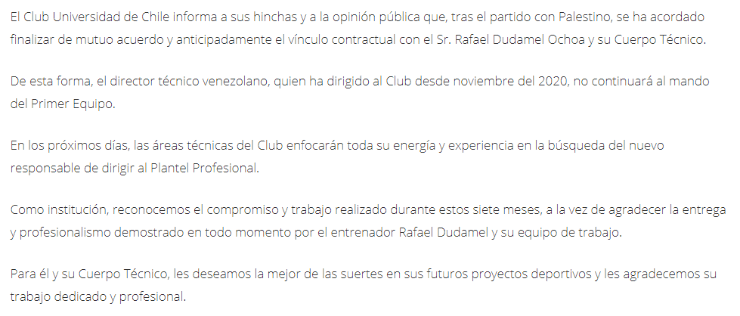 Una instancia la cual fue confirmada por el club minutos después de haber terminado el compromiso en La Cisterna, donde indicaron que el cuerpo técnico comandado por el llanero no continuará al mando del primer equipo, quien llegó en noviembre del 2020.