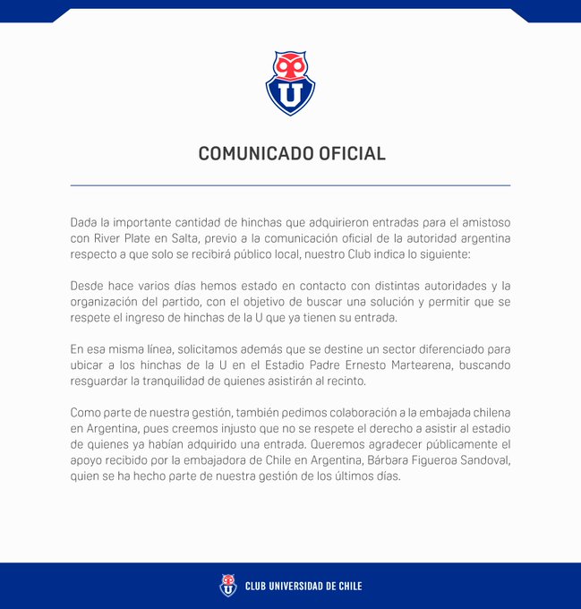 Muchos fueron los hinchas de Universidad de Chile que quedaron sorprendidos por un comunicado de la gobernación de Salta, donde se especificaba que no dejarían entrar a hinchas nacionales al amistoso contra River Plate.