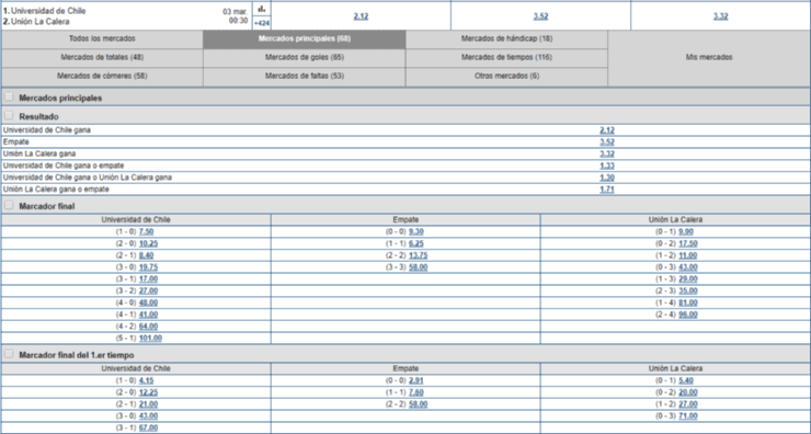 De la mano de Marathonbet puedes tener cientos de opciones para jugar durante los 90 minutos de Universidad de Chile vs Unión La Calera, como por ejemplo el marcador final del primer tiempo. Si crees que termina en empate sin goles, paga 2,91 veces lo que juegues, y 21,00 veces lo apostado si crees que tras los primeros 45 minutos termina con marcador de 2-1 a favor de Universidad de Chile.