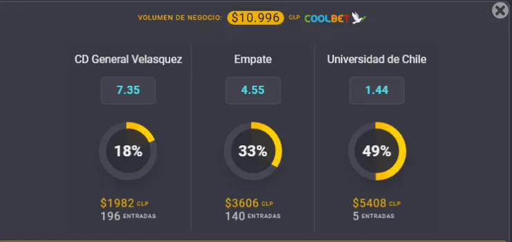 Para el OSO de Coolbet, el gran favorito para ganar este partido de la tercera ronda de la Copa Chile 2022 es Universidad de Chile, que paga 1,44 veces lo que juegues, por sobre los 7,35 que paga General Velásquez, si crees que ellos ganan. Ahora, si empatan, el resultado paga 4,55 veces lo que apuestes.