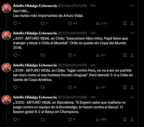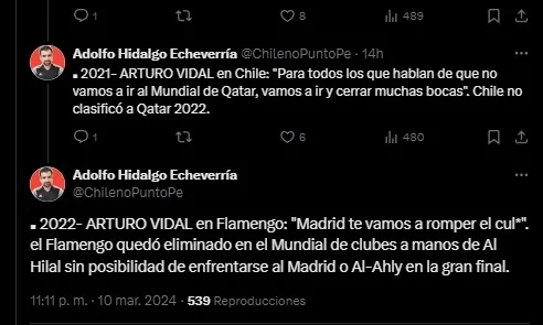 Fue en la red social X, donde el usuario Adolfo Hidalgo Echeverría publicó un listado de declaraciones donde Arturo Vidal que terminaron convirtiéndose en verdaderas mufas.