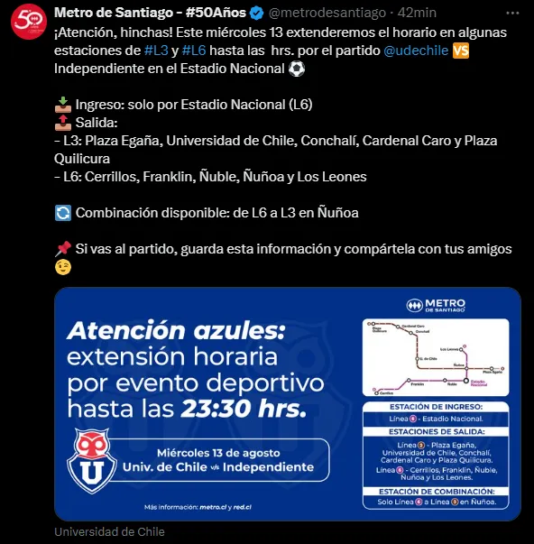 El servicio extenderá su horario en algunas estaciones de las Líneas 3 y 6, permitiendo el retorno de los hinchas una vez finalizado el compromiso. El ingreso al estadio será exclusivamente por la estación Estadio Nacional de Línea 6, mientras que las salidas se habilitarán de forma selectiva: en Línea 3, Plaza Egaña, Universidad de Chile, Conchalí, Cardenal Caro y Plaza Quilicura; y en Línea 6, Cerrillos, Franklin, Ñuble, Ñuñoa y Los Leones.