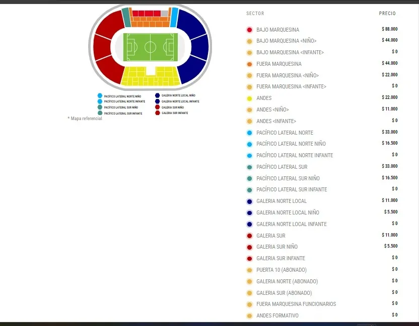 La galería tanto norte como sur se mantiene el 11 mil pesos, Tribuna Andes 22 mil, Pacífico Lateral norte y sur 33 mil, Fuera de Marquesina 44 mil y Bajo Marquesina 88 mil. Las entradas de niño tienen un valor del 50% en relación al adulto acorde a los mencionados sectores.