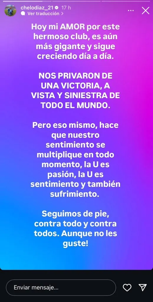 Allí, el ex Selección de Chile escribió, ‘‘Nos privaron de una victoria, a vista y siniestra de todo el mundo”. Y para cerrar su posteo, envió un mensaje a los hinchas de la ‘U’, ”Seguimos de pie, contra todo y contra todos. Aunque no les guste!”.