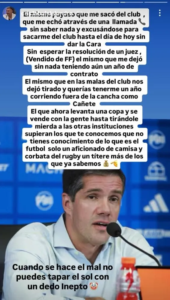 Aquello no dejó para nada contento a un exgolero del cuadro universitario. Cristóbal Campos estalló públicamente contra un dirigente del club donde militó anteriormente y utilizó sus redes sociales para lanzar duras acusaciones contra Clark: “El mismo payaso que me sacó del club, que me echó a través de una llamada sin saber nada y excusándose para sacarme del club hasta el día de hoy sin dar la cara”, comenzó escribiendo el exgolero del SAU.