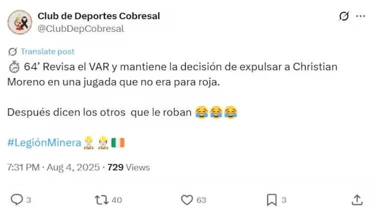 ¿El motivo? Desde Cobresal consideraron que la tarjeta roja directa fue injusta y no tardaron en expresar su molestia en redes sociales, publicando un polémico mensaje contra la U en su cuenta oficial de X (antes Twitter).