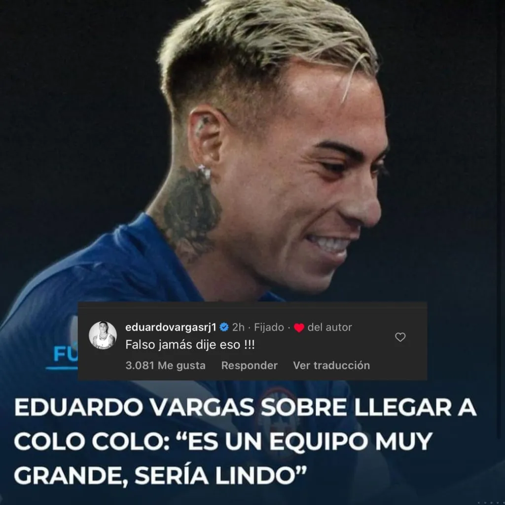 “Falso, jamás dije eso”, fue lo que señaló Eduardo Vargas en respuesta al post de la cuenta de Instagram ‘Outofcontextuch_’, quien había publicado una imagen de los supuestos dichos del jugador sobre la opción de poder arribar a Colo Colo.