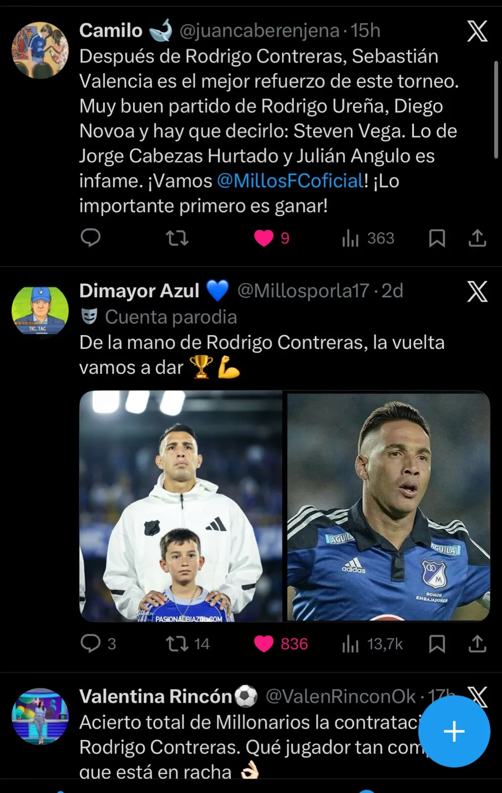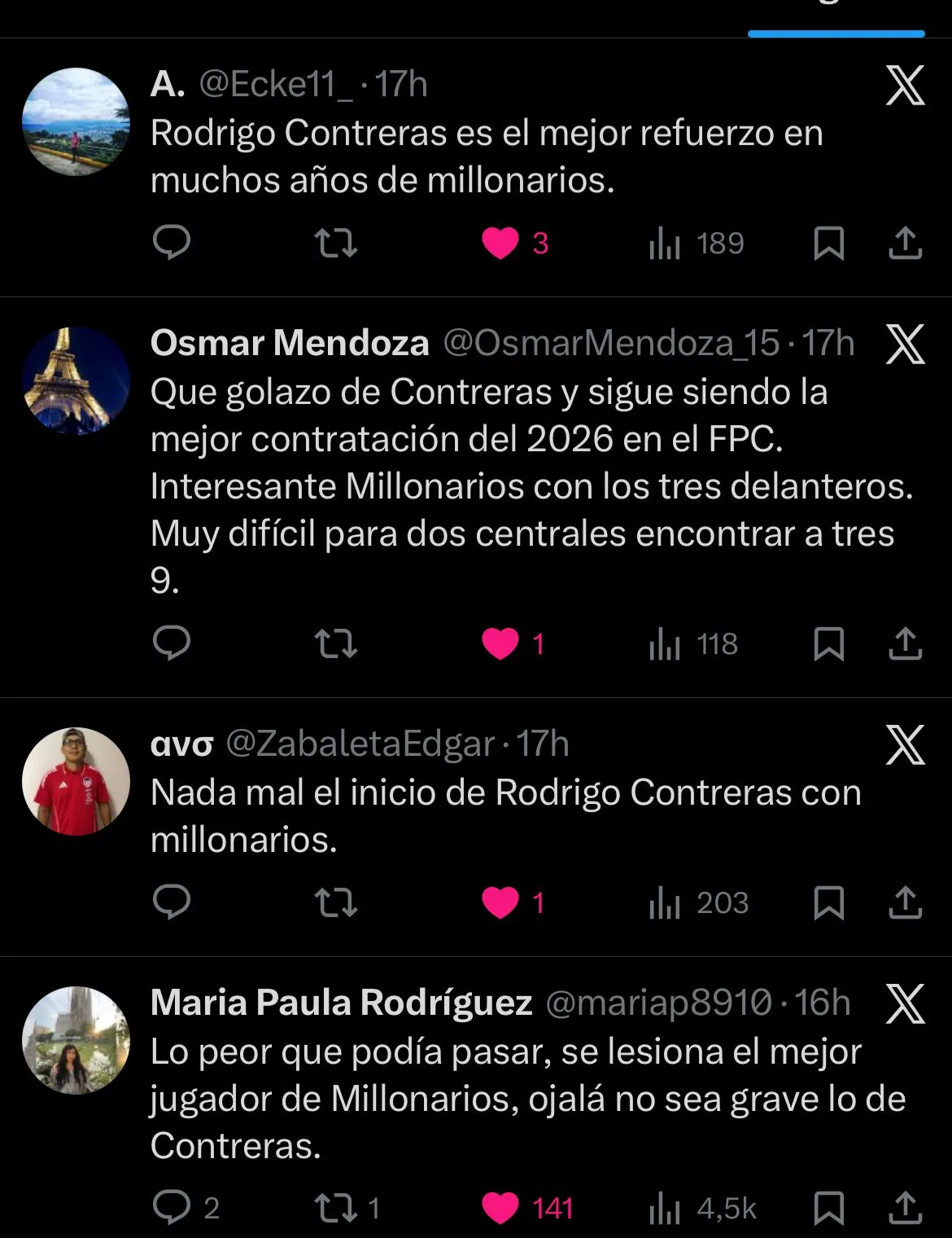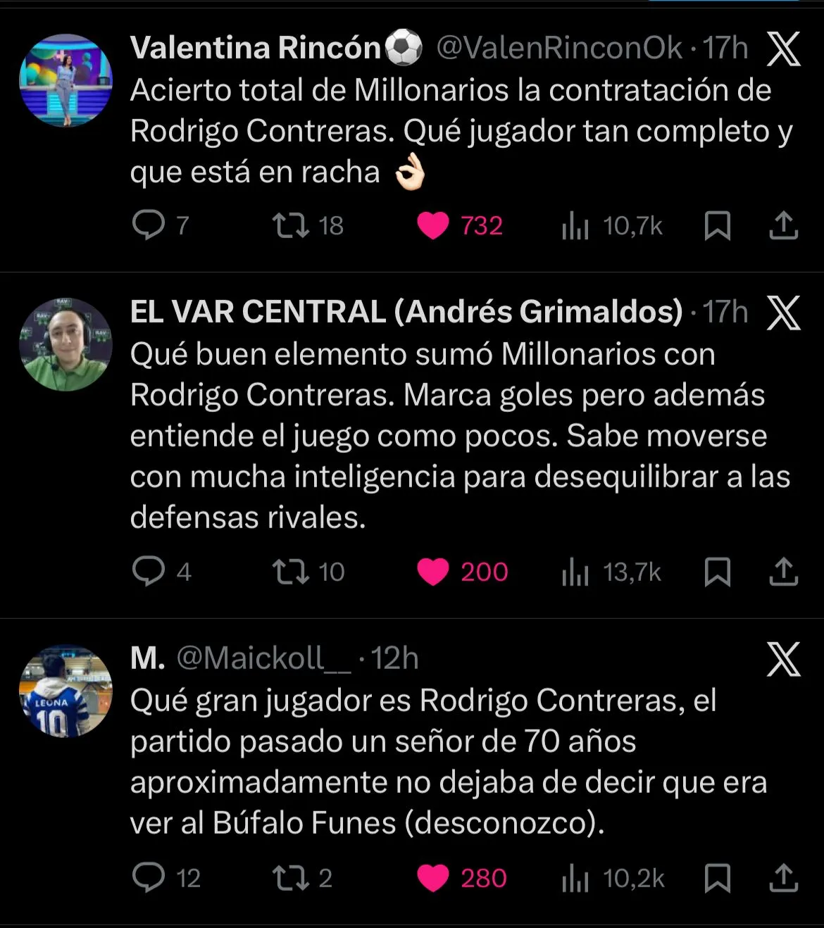 “Rodrigo Contreras es el mejor refuerzo en muchos años de Millonarios”, señaló uno de sus fanáticos en su cuenta de ‘X’.