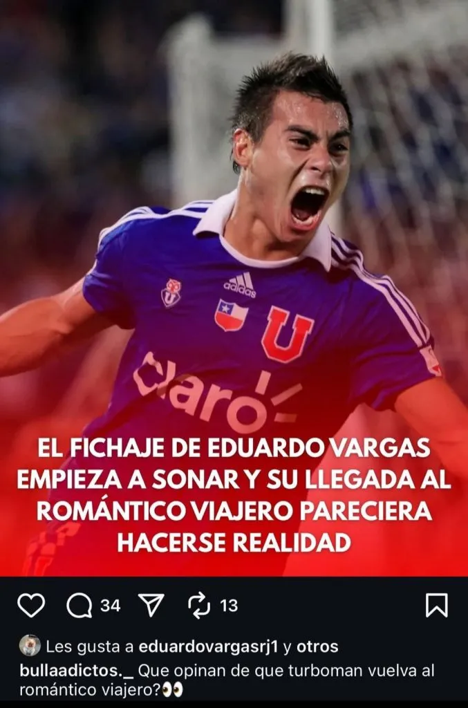 En una publicación de Instagram de la cuenta ‘Bullaadictos’, se subió una imagen sobre la noticia de Eduardo Vargas y su posible vuelta a la Universidad de Chile, en el que señalaron ‘su llegada al romántico viajero pareciera hacerse realidad’.