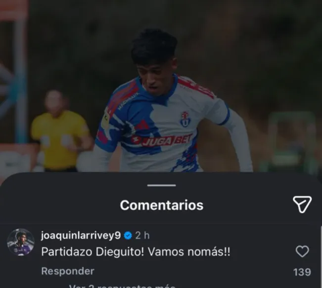 A través de la cuenta de Instagram de Vargas, el goleador trasandino felicitó al futbolista de 19 años con un mensaje directo y cercano: “Partidazo Dieguito, vamos nomás”.