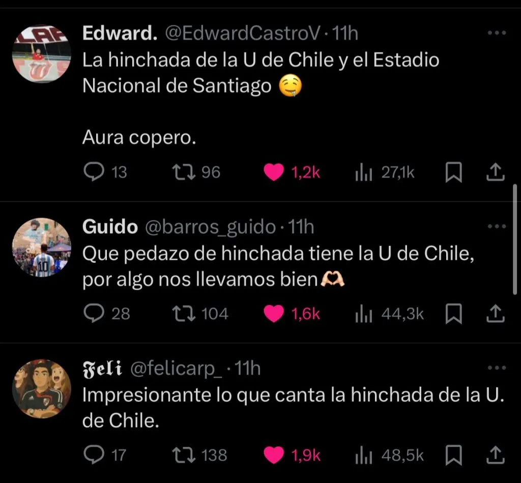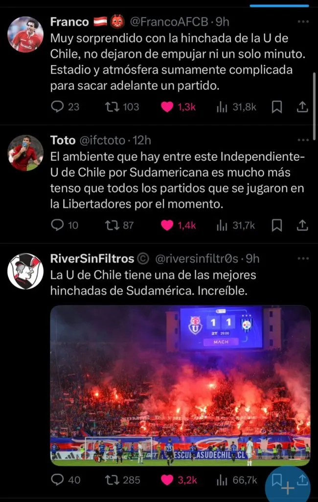 Así es lo que se pudo ver en distintas cuentas de ‘X’, en la que particularmente los hinchas argentinos se mostraron gratamente sorprendidos por la hinchada de la Universidad de Chile y el gran ambiente que generaron para este duelo.