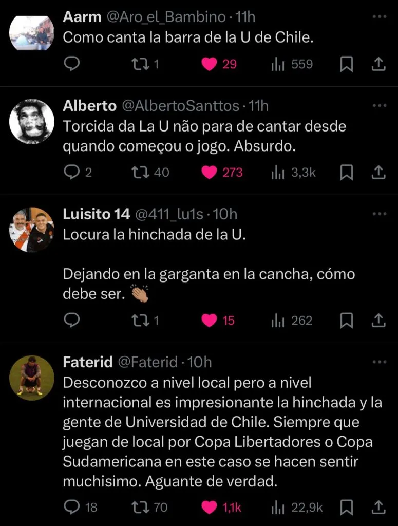 “Desconozco a nivel local pero a nivel internacional es impresionante la hinchada y la gente de Universidad de Chile. Siempre que juegan de local por Copa Libertadores o Copa Sudamericana en este caso se hacen sentir muchisimo. Aguante de verdad”, señaló un hincha.