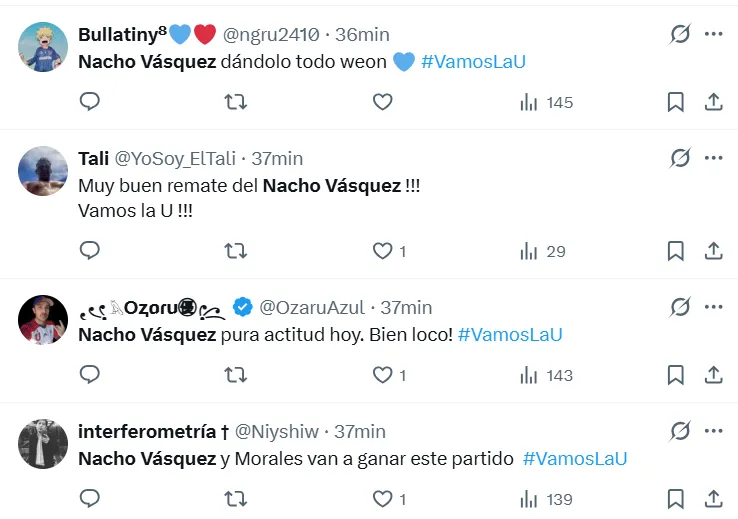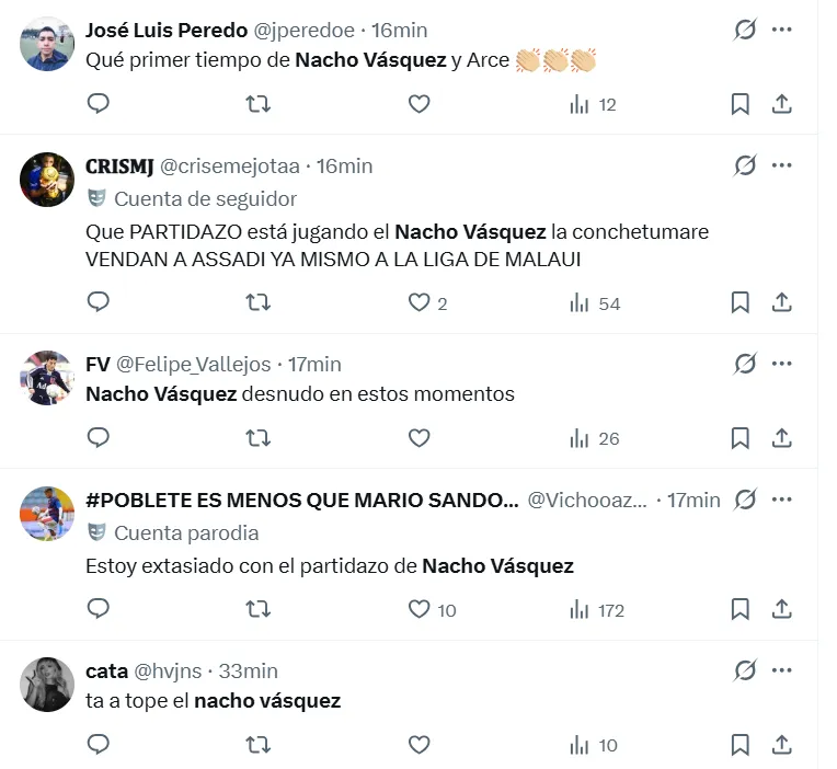 “Nacho Vásquez desnudo en estos momentos”, o “qué primer tiempo de Nacho Vásquez y Arce”, aseguraron los internautas en X.