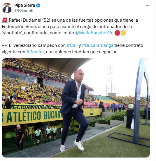 Rafael Dudamel es una de las fuertes opciones que tiene la Federación Venezolana para asumir el cardo de entrenador de la ‘Vinotinto‘. El venezolano campeón con Cali y Bucaramanga, tiene contrato vigente con Pereira, con quienes tendrían que negociar”, informó.