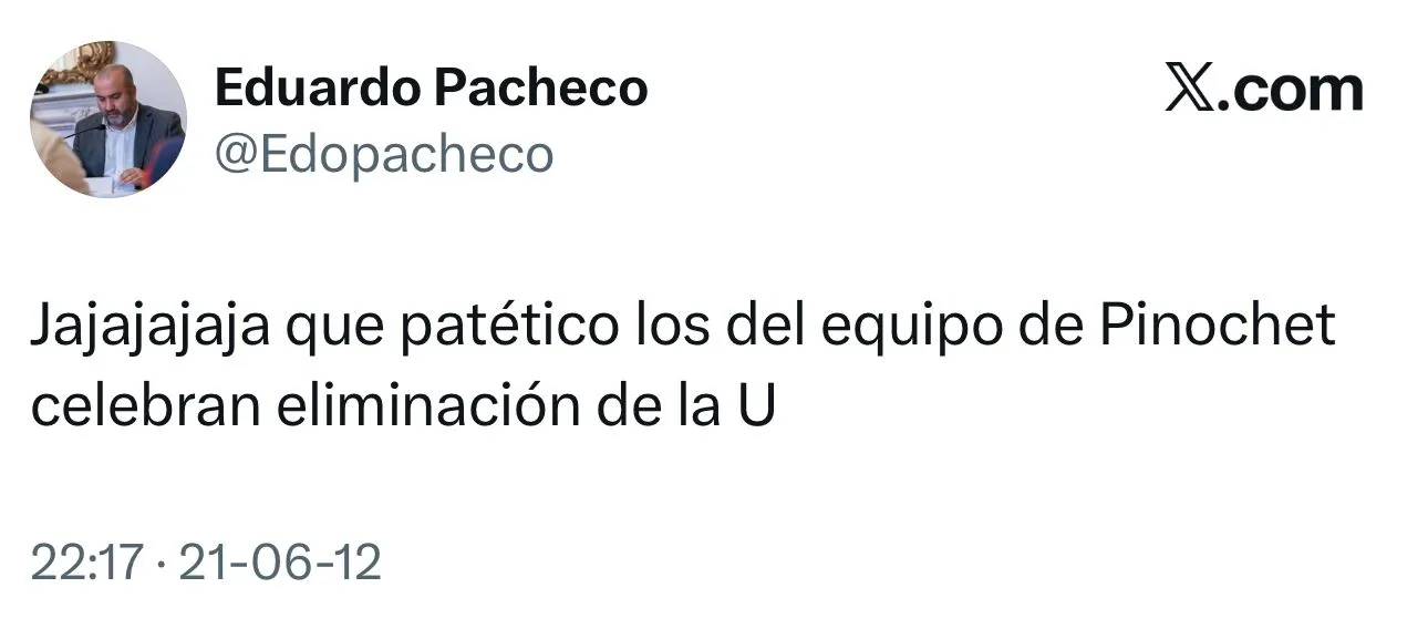 “Jajajajaja qué patético, los del equipo de Pinochet celebran eliminación de la U”, escribió la autoridad en aquella ocasión en X (Ex Twitter).
