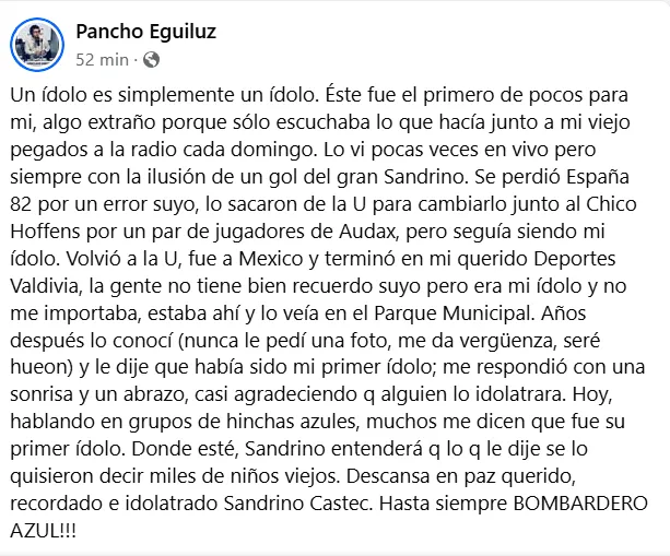 “Años después lo conocí (nunca le pedí una foto, me da vergüenza, seré hueon) y le dije que había sido mi primer ídolo; me respondió con una sonrisa y un abrazo, casi agradeciendo q alguien lo idolatrara. Hoy, hablando en grupos de hinchas azules, muchos me dicen que fue su primer ídolo. Donde esté, Sandrino entenderá q lo q le dije se lo quisieron decir miles de niños viejos. Descansa en paz querido, recordado e idolatrado Sandrino Castec. Hasta siempre BOMBARDERO AZUL!!!”, remató un emocionado Eguiluz.
