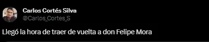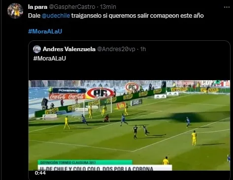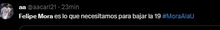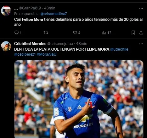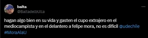 “Den toda la plata que tengan por Felipe Mora, Universidad de Chile”, “hagan algo bien en su vida y gasten el cupo extranjero en el mediocampista y en el delantero a felipe mora, no es dificil”, “Felipe Mora es lo que necesitamos para bajar la 19. Mora a la U”, entre otros.