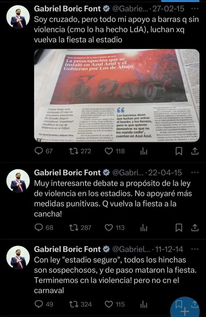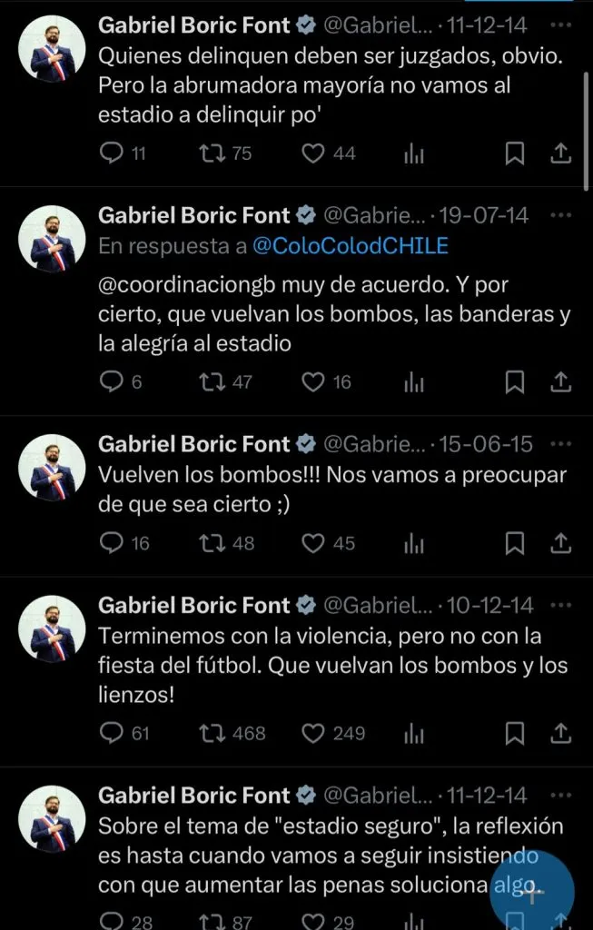 En la red social de ‘X’, los diversos usuarios han vuelto a sacar a la luz diversos post del pasado del hoy mandamás de nuestro país, en la que pedía a gritos el que vuelva la fiesta a los estadios del fútbol chileno y prometía luchar para que aquello fuera posible.