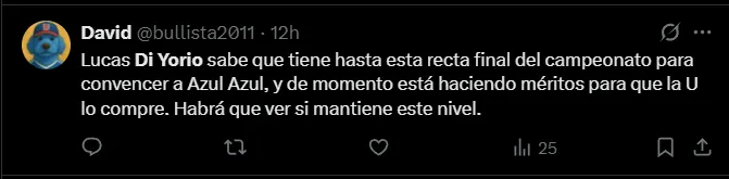 A raíz de su nivel, los hinchas bullangueros han comenzado a expresar de manera contundente su opinión sobre el futuro del atacante en el club, pues recordar que Di Yorio está a préstamo hasta el 31 de diciembre desde Athletico Paranaense de Brasil.