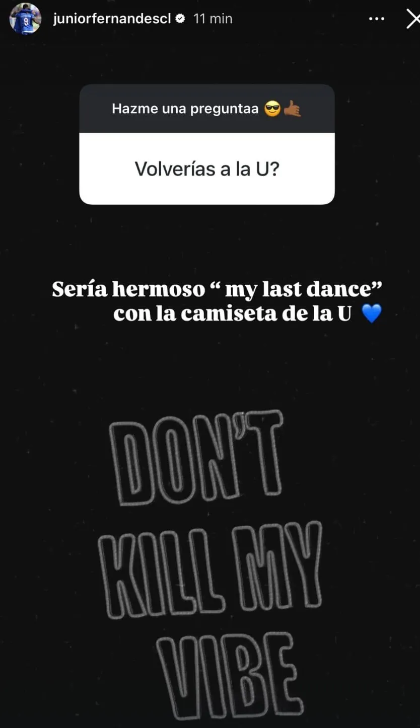 “Sería hermoso ‘my last dance’ con la camiseta de la U”, escribió el jugador, dejando entrever que vería con muy buenos ojos cerrar su carrera defendiendo nuevamente los colores azules. Una frase breve, pero cargada de simbolismo y emoción.