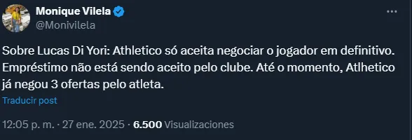 “Sobre Lucas Di Yorio: El Atlético sólo acepta negociar con el jugador de forma permanente. El club no acepta el préstamo. Hasta el momento, el Atlético ya ha rechazado 3 ofertas por el deportista”, confesó.