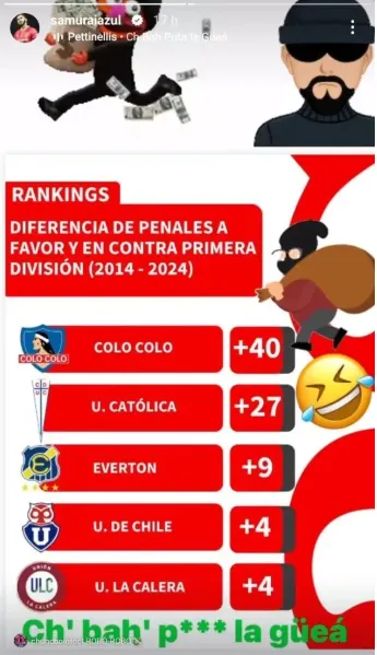 ¿Qué fue lo llamativo de esto? El Samurai Azul aprovechó la ocasión para enviarle un palito a Colo Colo, puesto que publicó una story en la reconocida red social que fue acompañada por la canción “Ch Ba Puta La Güea” de Los Pettinellis y de varios gif animados de ladrones.