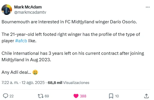 “El Bournemouth está interesado en el extremo Darío Osorio del FC Midtjylland. El extremo derecho de 21 años, que es zurdo, tiene el perfil del tipo de jugador que le gusta al Bournemouth. El internacional chileno tiene 3 años restantes en su contrato actual después de unirse al Midtjylland en agosto de 2023″, informó.