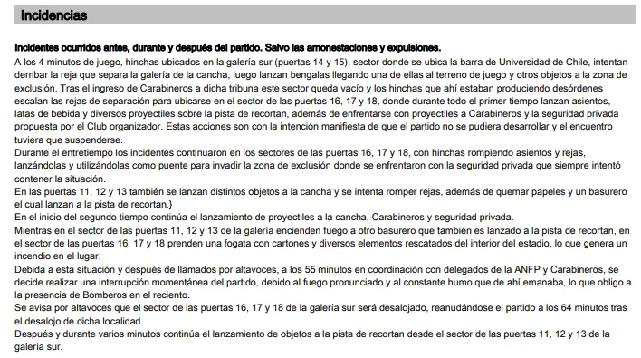 En un extenso escrito, el árbitro dio a conocer toda la información relevante de lo que fueron estos incidentes, los que sin duda hacen tambalear a la Universidad de Chile por la importante sanción que podría recibir.