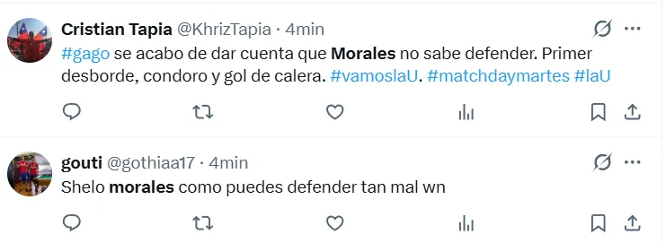 “Marca indecente”, “No sabe defender”, “Defiende tan mal” y “La espalda de Morales es una carretera” fueron algunos de los duros comentarios que dejaron los fanáticos del Chuncho durante el primer tiempo.