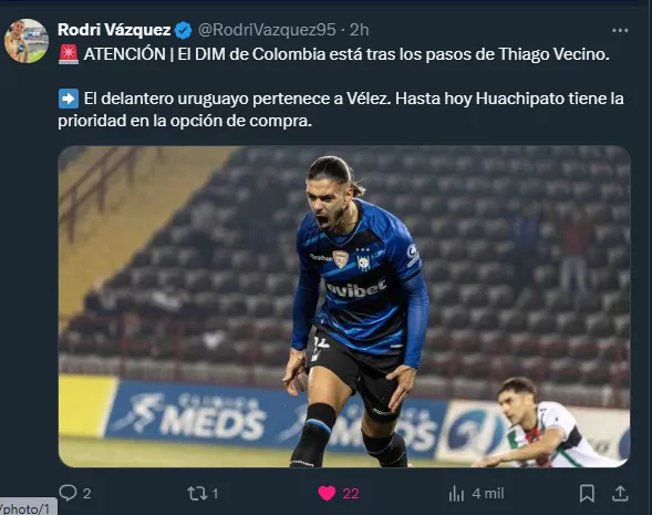 “El DIM de Colombia está tras los pasos de Thiago Vecino. El delantero uruguayo pertenece a Vélez. Hasta hoy Huachipato tiene la prioridad en la opción de compra”, informó.