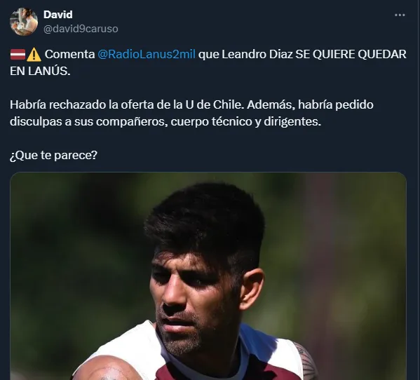 “Leandro Díaz se quiere quedar en Lanús. Habría rechazado la oferta de la U. de Chile. Además, habría pedido disculpas a sus compañeros, cuerpo técnico y dirigentes”, informaron.