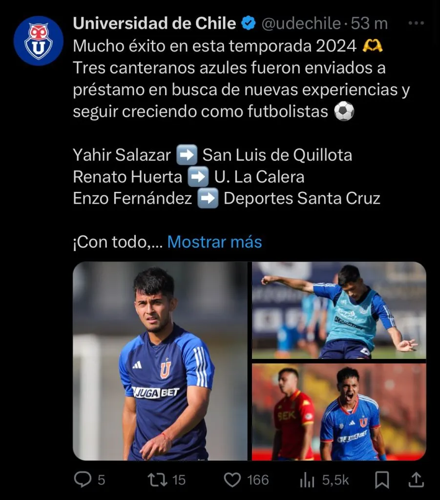 “Mucho éxito en esta temporada 2024. Tres canteranos azules fueron enviados a préstamo en busca de nuevas experiencias y seguir creciendo como futbolistas: Yahir Salazar a San Luis de Quillota, Renato Huerta a Unión La Calera y Enzo Fernández a Deportes Santa Cruz. ¡Con todo muchachos!”, indicaron.