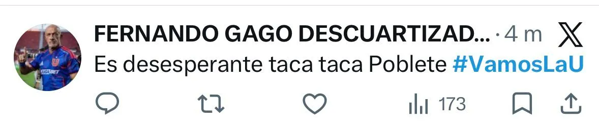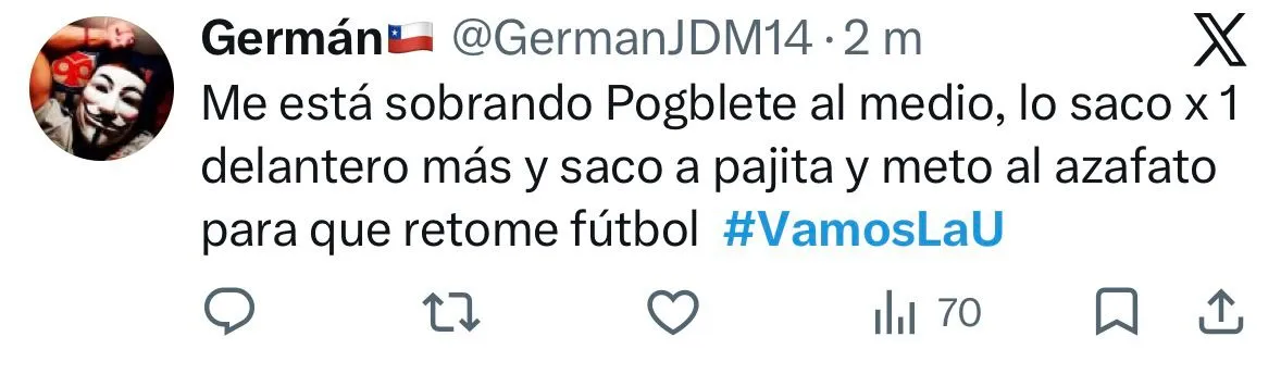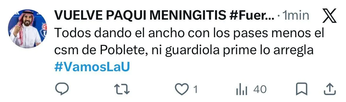 “Siempre hay unio que juega como las hue… Poblete siempre”; “Es desesperante taca-taca Poblete”; “Ni Guardiola prime lo arregla”, fueron parte de los comentarios en X.