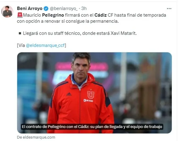 Se espera que Pellegrino pueda aterrizar a suelo español en las próximas horas, para poder ser oficializado como el nuevo director técnico del Cádiz y trabajar arduamente para lograr mantener al club en primera división.