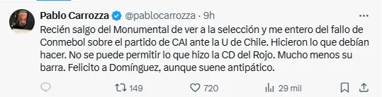 “Recién salgo del Monumental de ver a la selección y me entero del fallo de Conmebol sobre el partido de CAI ante la U de Chile. Hicieron lo que debían hacer. No se puede permitir lo que hizo la CD del Rojo. Mucho menos su barra. Felicito a Domínguez, aunque suene antipático”, declaró.