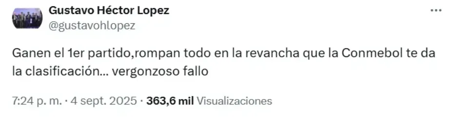 El fallo provocó reacciones encontradas en toda Sudamérica, y fue Gustavo López, comentarista de ESPN Argentina, quien a través de su cuenta de X criticó con dureza al ente rector del fútbol continental.