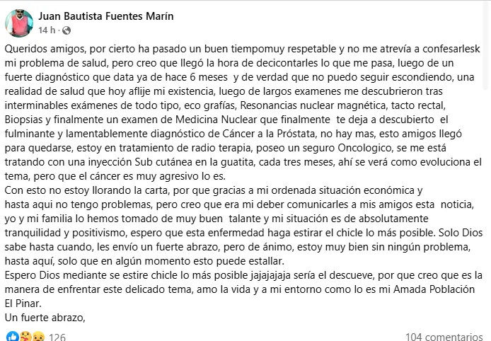 “Creo que era mi deber comunicarles a mis amigos esta noticia. Yo y mi familia lo hemos tomado de muy buen talante y mi situación es de absolutamente tranquilidad y positivismo, espero que esta enfermedad haga estirar el chicle lo más posible. Solo Dios sabe hasta cuando”,