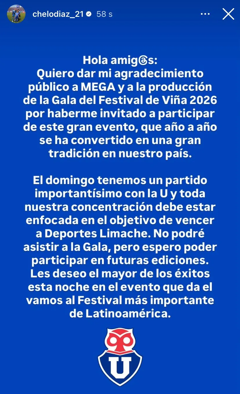 “Hola amig@s: Quiero dar mi agradecimiento público a MEGA y a la producción de la Gala del Festival de Viña 2026 por haberme invitado a participar de este gran evento, que año a año se ha convertido en una gran tradición en nuestro país”, comenzó diciendo el futbolista de 39 años.