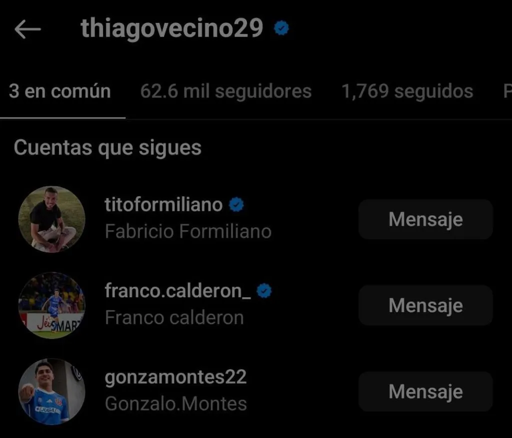 Dentro de quienes se puede ver que sigue en la mencionada plataforma se encuentran Fabricio Formiliano (compatriota suyo), Gonzalo Montes (ex compañero en Huachipato) y a Franco Calderón, seguramente entre otros.