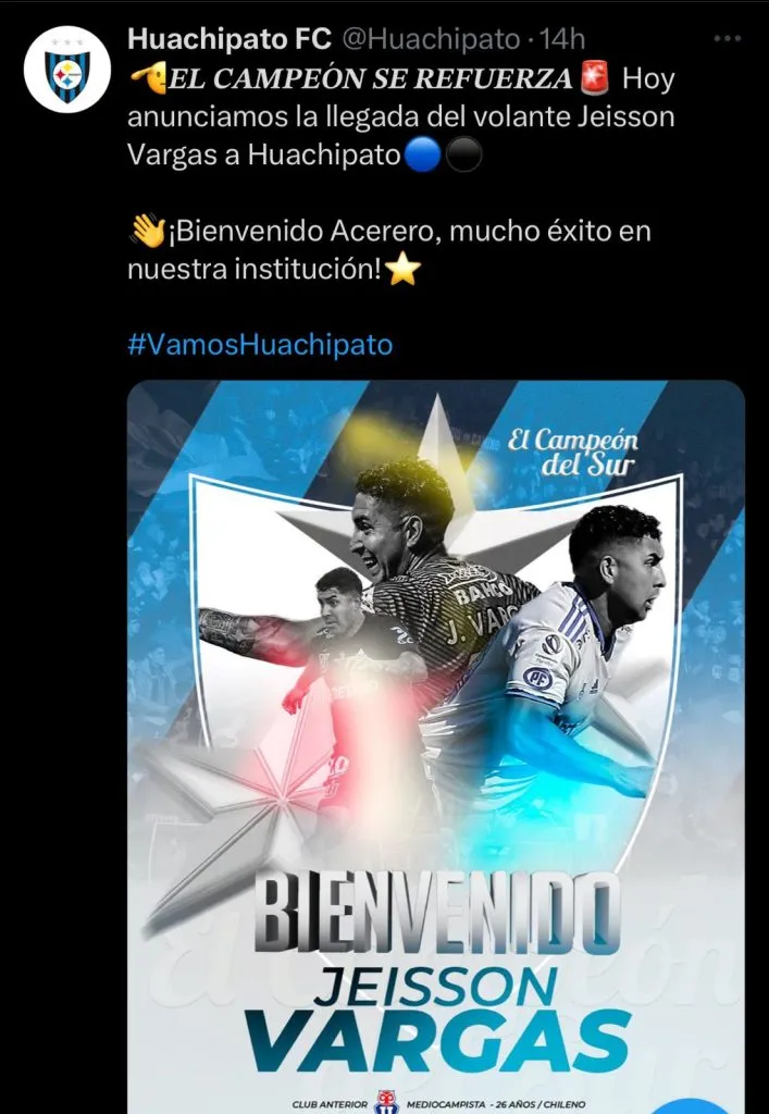 “El campeón se refuerza. Hoy anunciamos la llegada del volante Jeisson Vargas a Huachipato. ¡Bienvenido Acerero, mucho éxito en nuestra institución!”, indicaron desde el club.