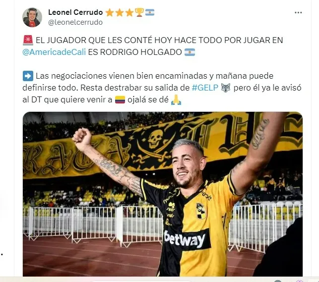 El jugador que les conté hoy (ayer) hace todo por jugar en América de Cali es Rodrigo Holgado. Las negociaciones vienen bien encaminadas y mañana (hoy) puede definirse todo. Resta destrabar su salida de Gimnasia, pero él ya le avisó al DT que quiere venir, ojalá se dé”, declaró en su cuenta de ‘X’.