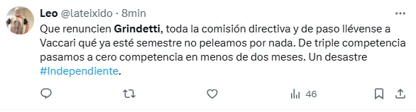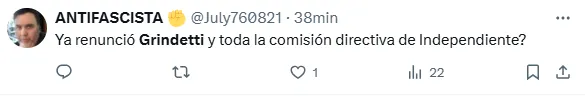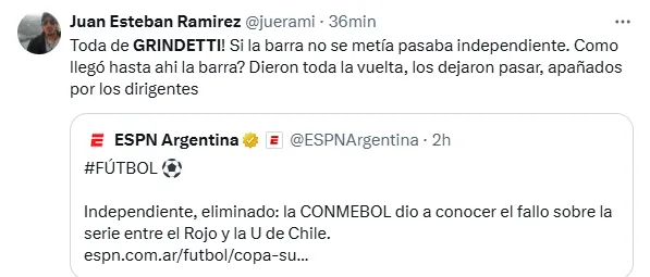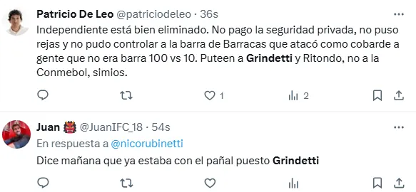 Hasta la hinchada del Rojo fue más empática y entendió el asunto mejor que su presidente. Así lo dieron a entender al menos en redes: “na no podes tirar esa hermano, tan partidario vas a ser de el mafia macrista de Grindetti? paso lo que tenia q pasar hermano, acá se organizo todo, acá se tiene q brindar seguridad al máximo para q no pasen esas cosas, da lo mismo quien provoca, no son nenes de 4 años. Lamentable”.
