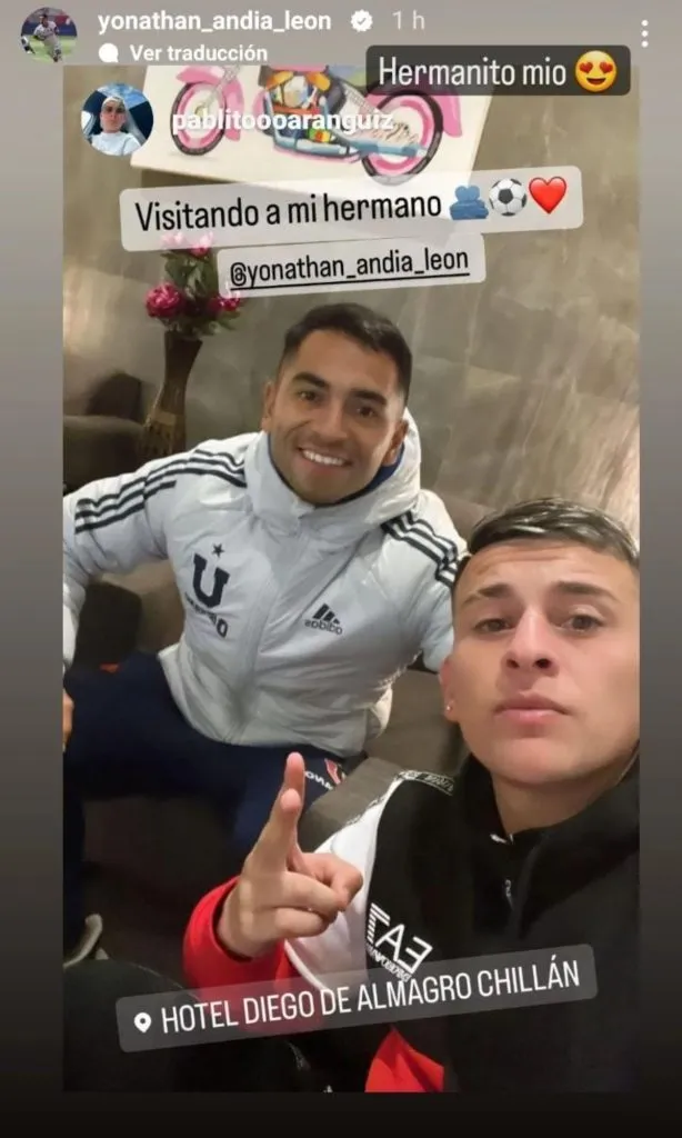 Este viernes el volante se trasladó hasta el hotel de concentración de la U en Chillán. Allí compartió con el lateral derecho, Yonathan Andía, quien publicó una foto del reencuentro.