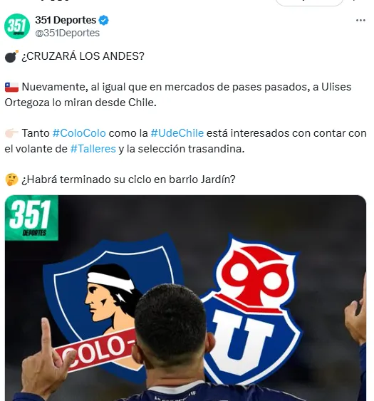 “¿Cruzará Los Andes?: Nuevamente, al igual que en mercados de pases pasados, a Ulises Ortegoza lo miran desde Chile. Tanto Colo Colo como la U. de Chile están interesados con contar con el volante de Talleres y la selección trasandina”, informaron.