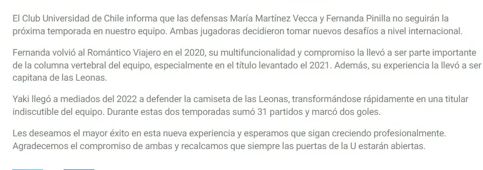 El Club Universidad de Chile informa que las defensas María Martínez Vecca y Fernanda Pinilla no seguirán la próxima temporada en nuestro equipo. Ambas jugadoras decidieron tomar nuevos desafíos a nivel internacional”, fue lo que indicó el comunicado.