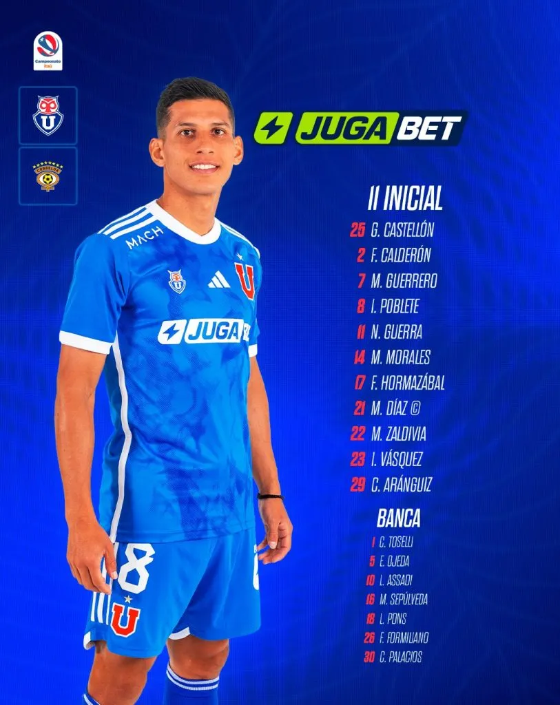 De esta forma, la Universidad de Chile saltará a la cancha con: Gabriel Castellón en portería; Fabián Hormazábal, Franco Calderón, Matías Zaldivia y Marcelo Morales en la defensa; Marcelo Díaz, Charles Aránguiz e Israel Poblete en el mediocampo; Maximiliano Guerrero, Nicolás Guerra e Ignacio Vásquez en el ataque.